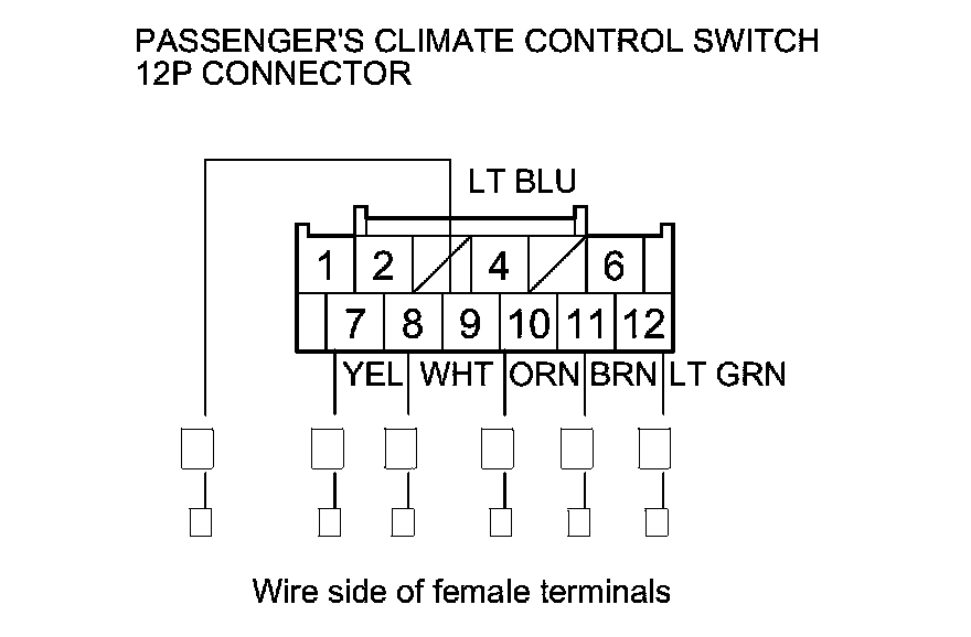 9. Check for continuity between the following terminals of the passenger's climate control switch 12P connector and the driver's climate control switch 16P connector.