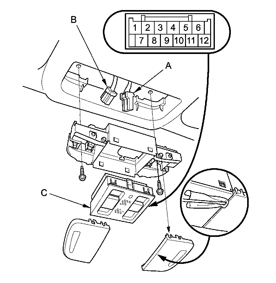 2. Disconnect the moonroof switch 12P connector (A) and the map light 3P connector (B).