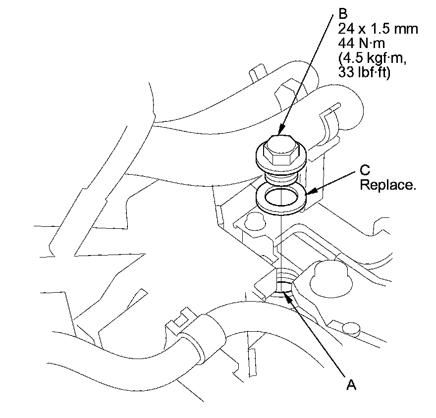 7. Install the ATF filler bolt (B) and a new sealing washer (C).