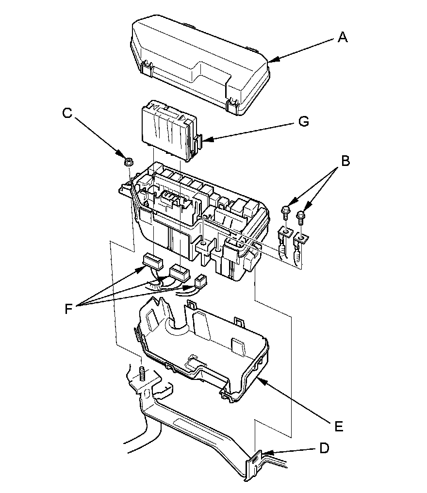 5. Remove the relay circuit board (G) from the under-hood fuse/relay box.