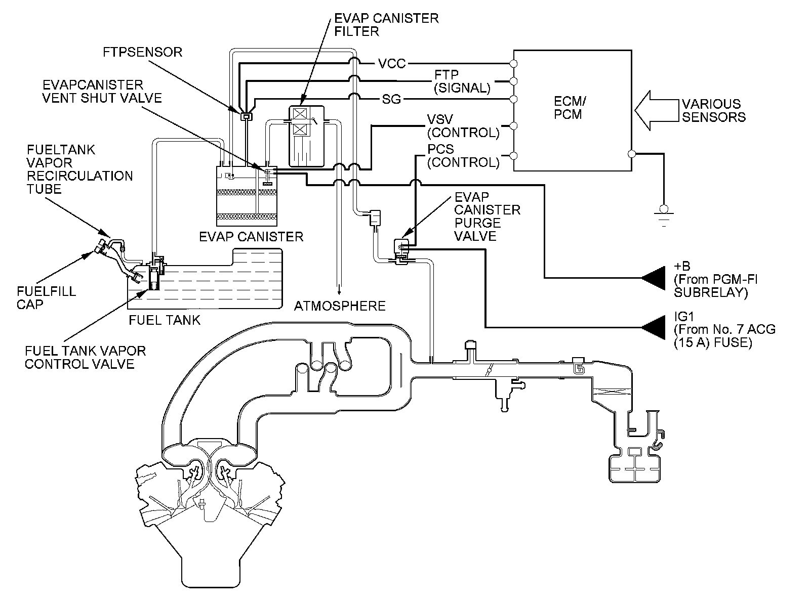 The EVAP controls minimize the amount of fuel vapor escaping to the atmosphere. Vapor from the fuel tank is temporarily stored in the EVAP canister until it can be purged from the canister into the engine and burned.