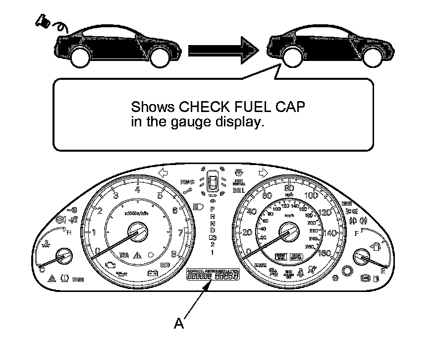 The first time a leak is detected, a CHECK FUEL CAP message appears in the gauge display (A). To scroll to another message, press the select/reset button. The "CHECK FUEL CAP" message appears each time you restart the engine until the system turns the message off. Turn the engine off, then replace or tighten the fuel fill cap until clicks at least once.