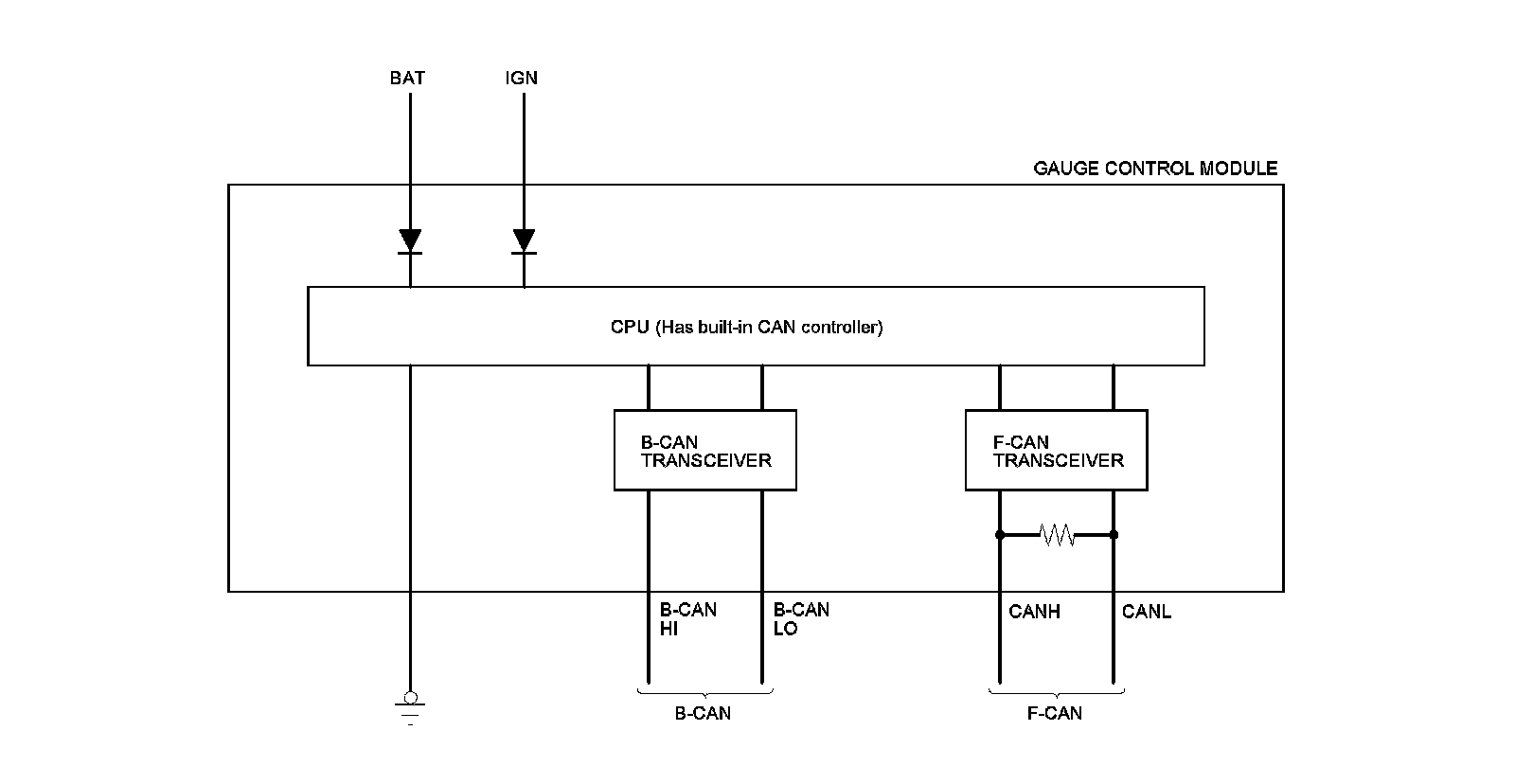 The gauge control module acts as a gateway to allow both systems to share information. The gauge control module translates and relays the information from B-CAN to F-CAN and from F-CAN to B-CAN.