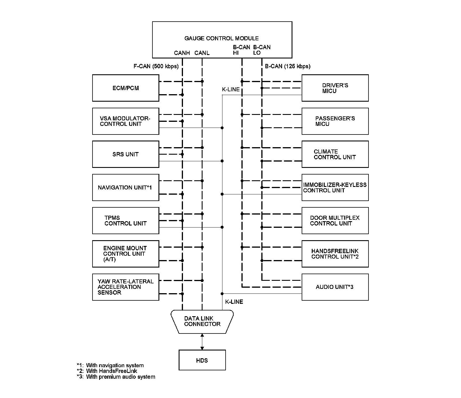 By connecting the HDS to the data link connector (DLC), the HDS can retrieve the diagnostic information from the driver's MICU via a diagnostic line called the K-LINE. The K-LINE is a separate communication line from the CAN lines, and is connected to most of the CAN related ECUs. The driver's MICU is a gateway between the HDS and B-CAN related ECUs, and sends B-CAN diagnostic information to the HDS. When doing a function test with the HDS, the HDS sends an output signal through the K-LINE to the driver's MICU. The driver's MICU either relays the request to another ECU, or commands the function itself.