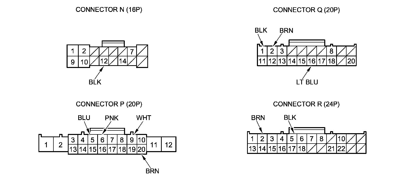 2. Disconnect driver's under-dash fuse/relay box connectors N, P, Q, and R.