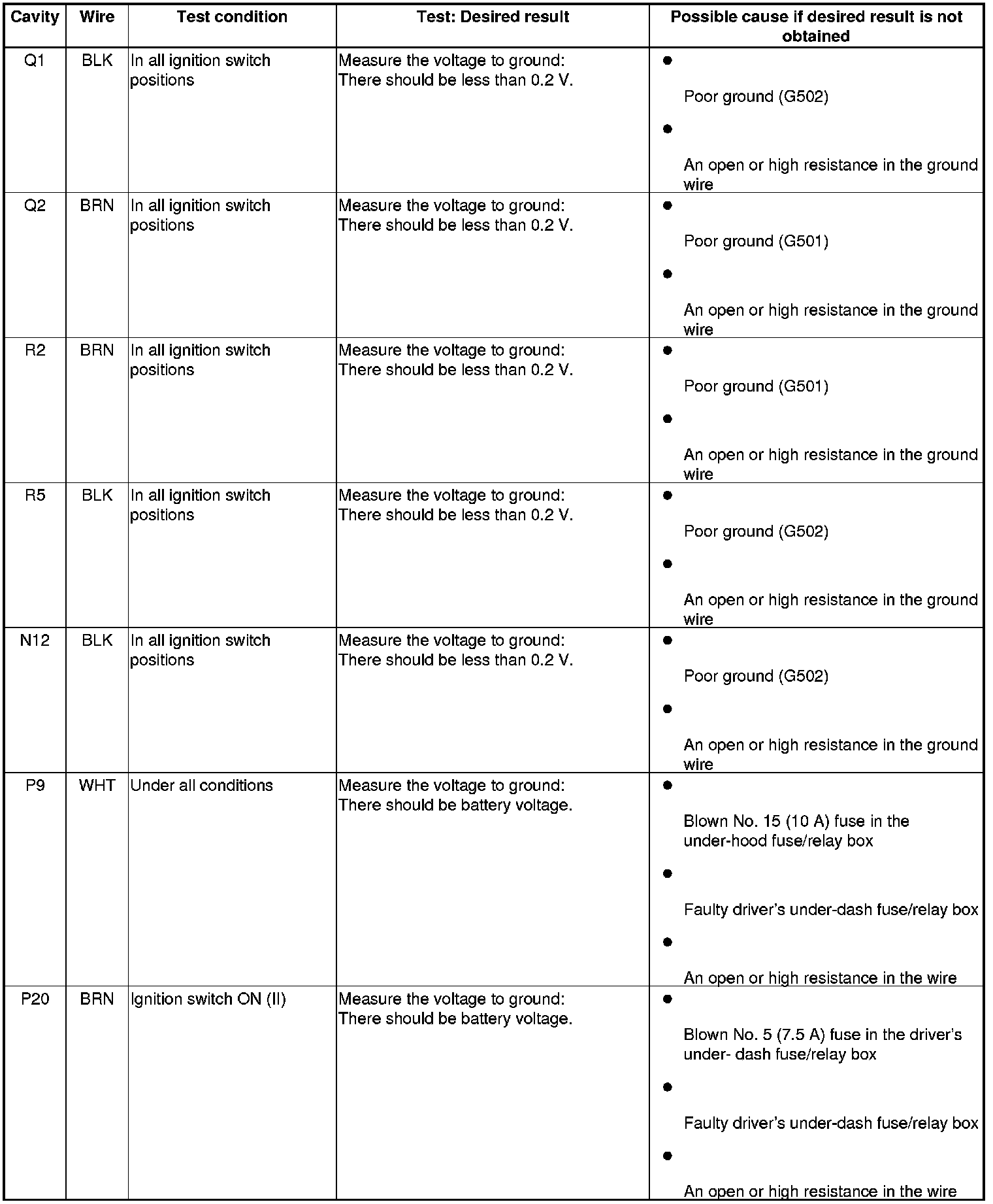5. Reconnect the connectors to the driver's under-dash fuse/relay box, turn the ignition switch to ON (II), and do the following input tests: