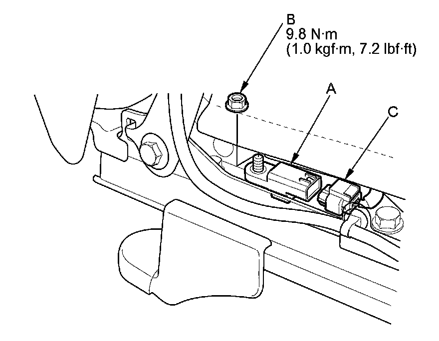 1. Install the driver's seat position sensor (A) with a nut (B), then connect the driver's seat wire harness 2P connector (C) to the driver's seat position sensor.