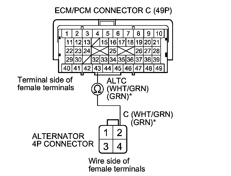 13. Check for loose terminals and connectors, then check for continuity between ECM/PCM connector terminal C43 and alternator 4P connector terminal No. 2.