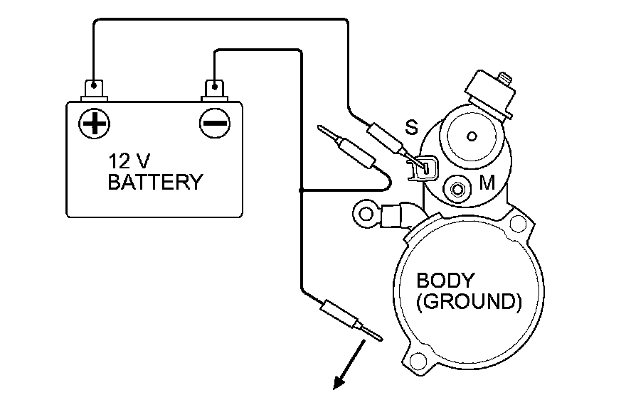 5. Connect the battery as shown. Make sure you disconnect the starter motor wire from the M terminal. If the starter pinion moves out, it is working properly.