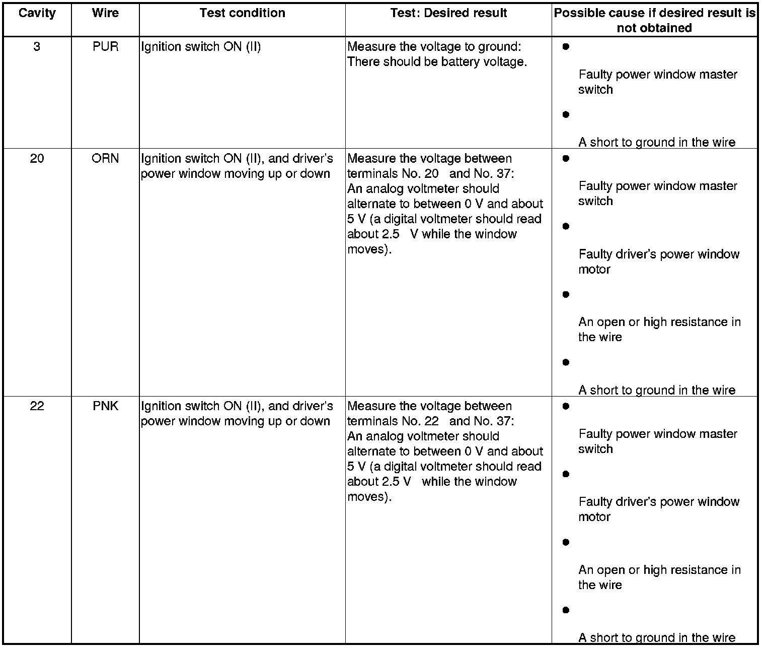 4. Reconnect the connector to the power window master switch, turn the ignition switch to ON (II), and do these input tests at the following connector.