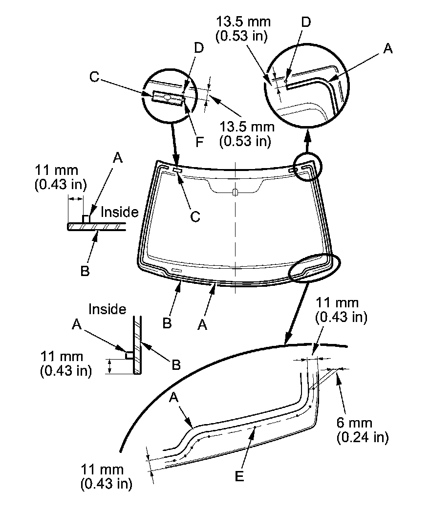 12. Apply glass primer to the upper clips mounting areas on the windshield (B), and let it dry. Remove the adhesive backing and attach the rubber dam A and the upper clips (C) to the inside of the windshield as shown: