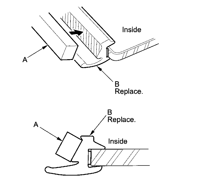 2. Remove the windshield molding (A) from the upper edge of the windshield (B). If necessary, cut the windshield molding with a utility knife.