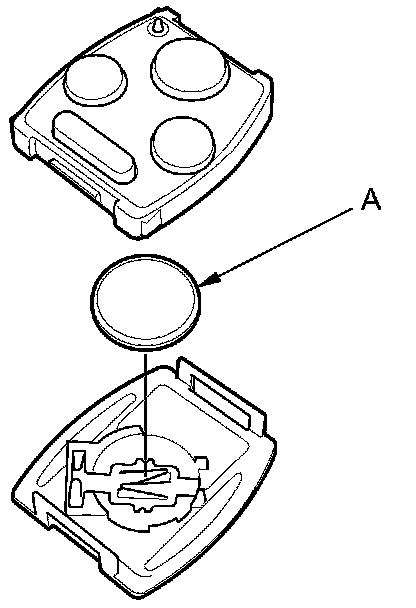 4. Replace the transmitter battery (A) with a new one (CR1616), and try to lock and unlock the doors with the transmitter by pressing the lock or unlock button five or six times.