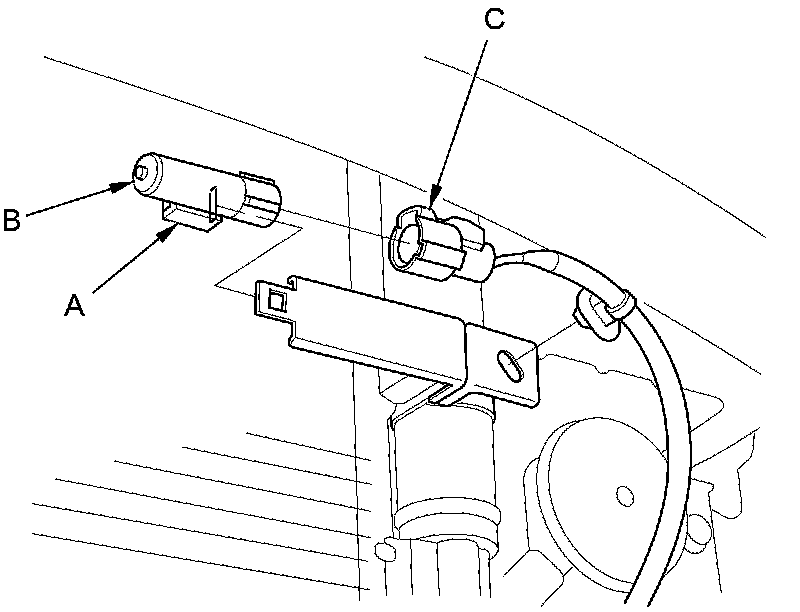 2. Lift the tab (A) to release the lock, then remove the outside air temperature sensor (B) from the receiver/dryer desiccant bracket. Disconnect the 2P connector (C) from the outside air temperature sensor.