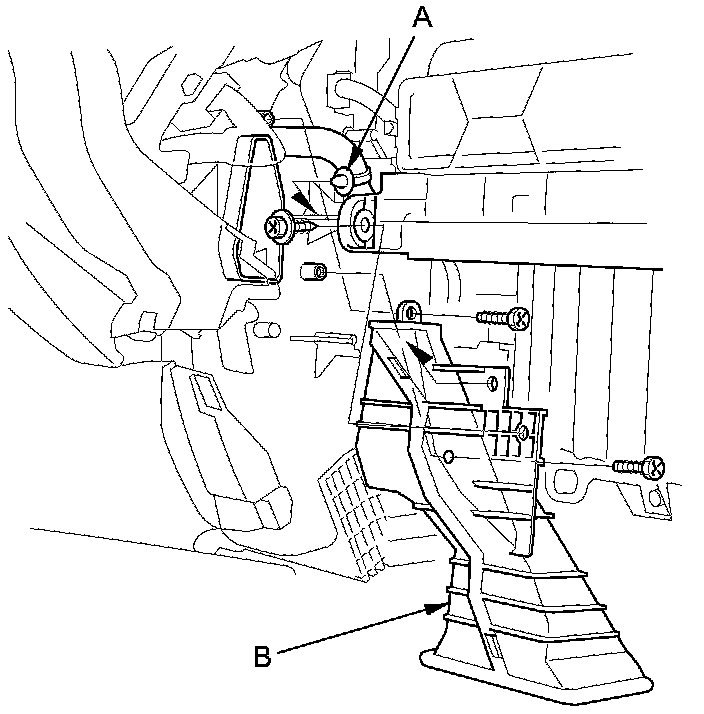 4. Remove the wire harness clip (A), the self-tapping screws, and the passenger's heater duct (B).