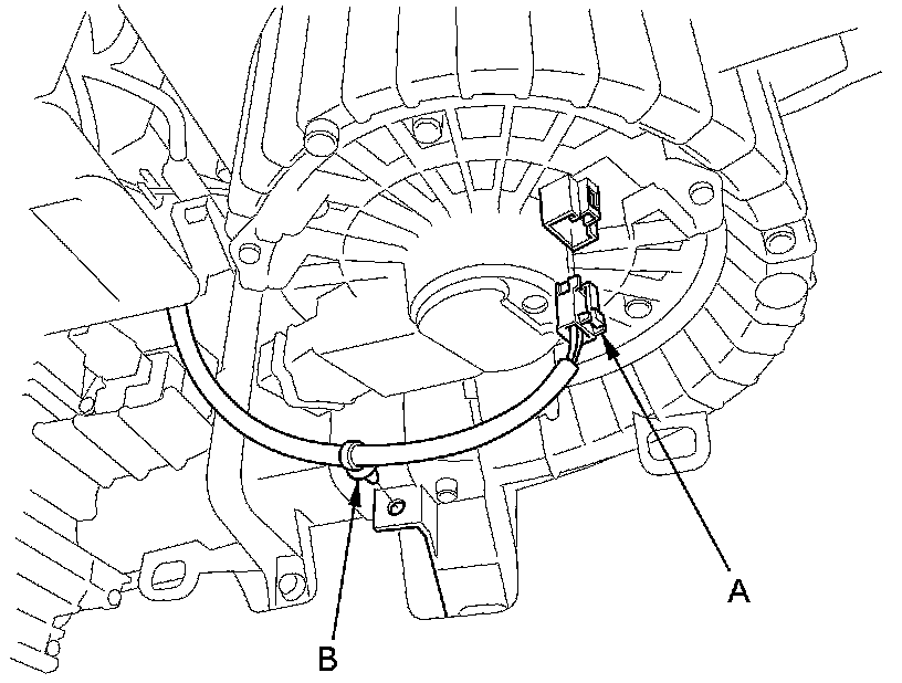 5. Disconnect the connector (A) from the blower motor. Remove the wire harness clip (B).