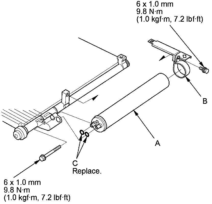 2. Remove the bolts from the A/C condenser, then remove the receiver/dryer (A), the bracket (B), and the O-rings (C).