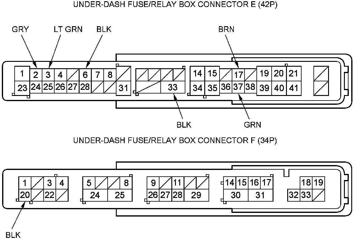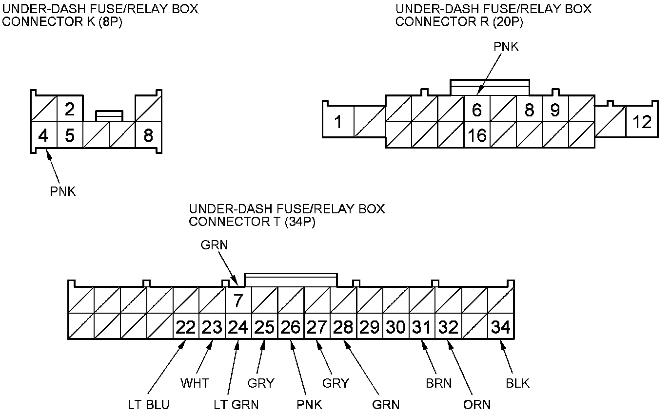 2. Disconnect driver's under-dash fuse/relay box connectors E, F, K, R, and T.
