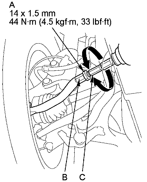 3. Loosen the tie-rod locknuts (A) while holding the flat surface sections (B) of the tie-rod end with a wrench, and turn both tie-rods (C) until the front toe is within specifications.