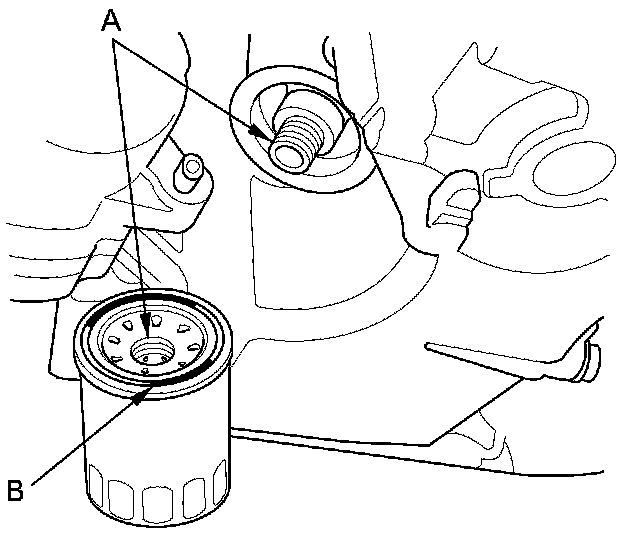 4. Inspect the threads (A) and the rubber seal (B) on the new filter. Clean the seat on the oil pan, then apply a light coat of new engine oil to the filter rubber seal. Use only filters with a built-in bypass system.