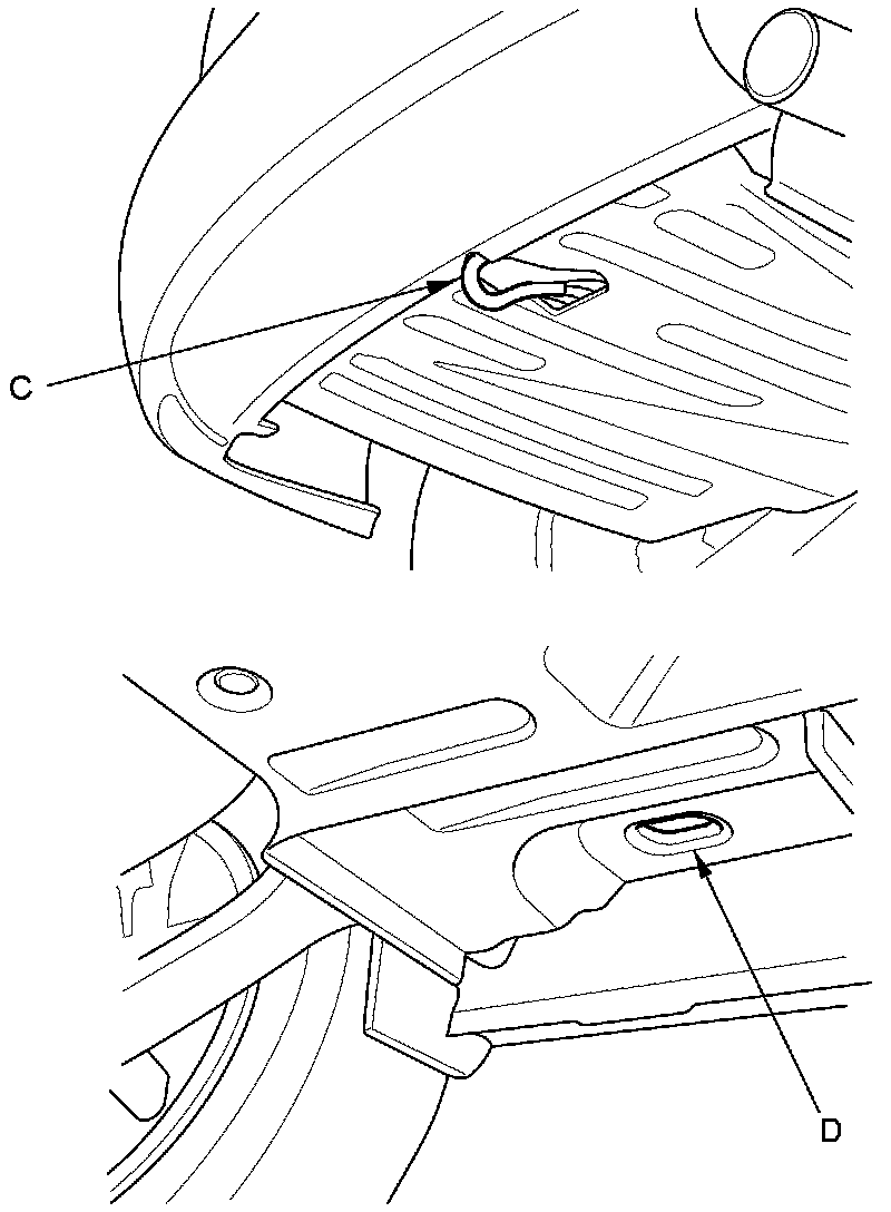 To accommodate the flat-bed tow truck equipment, the vehicle is equipped with front towing hooks (A), front tie down hook slots (B), a rear towing hook (C), and rear tie down hook slots (D).