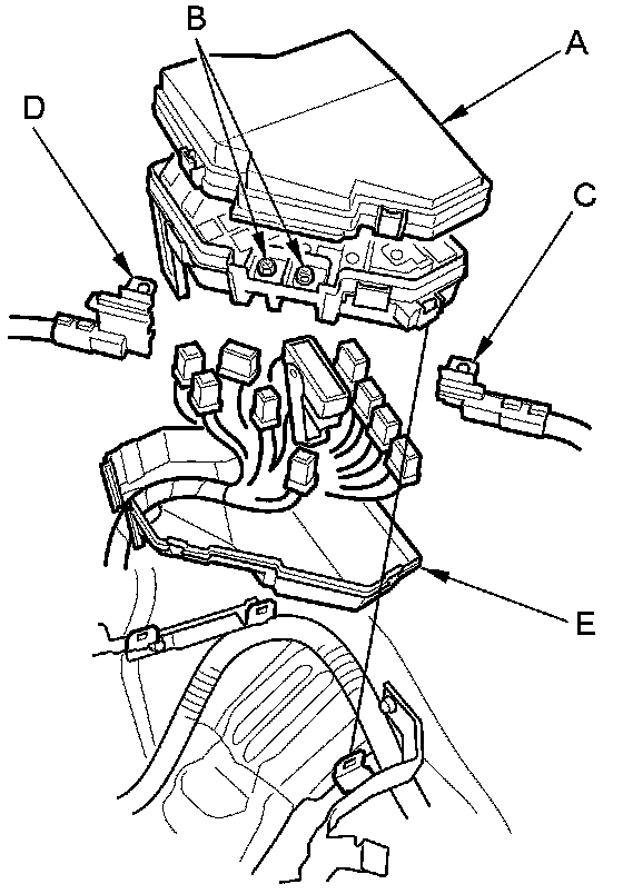 3. Remove the bottom cover (E) from the under-hood fuse/relay box.