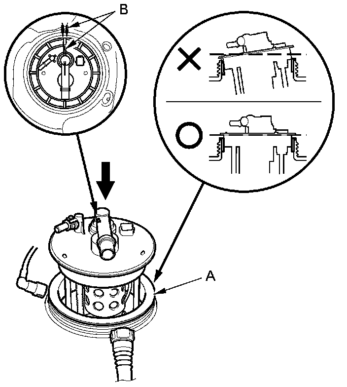 3. Align the marks (B) on the fuel tank and the fuel tank unit, then insert the fuel tank unit into the fuel tank until it sits on the base gasket.