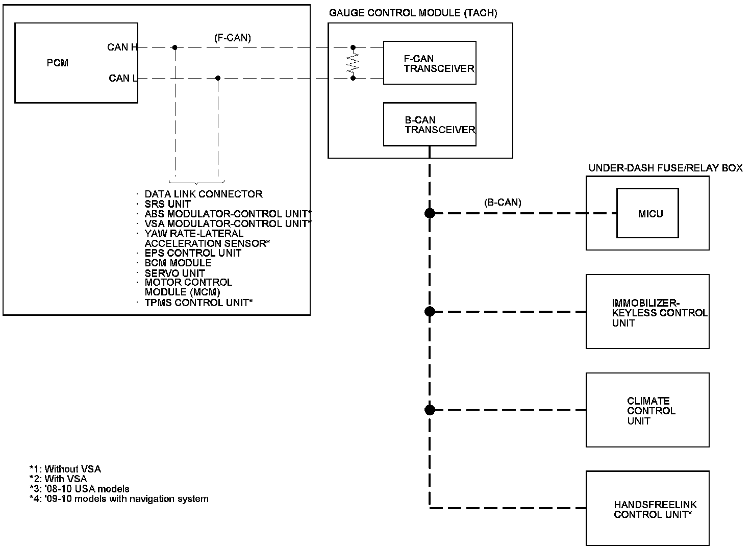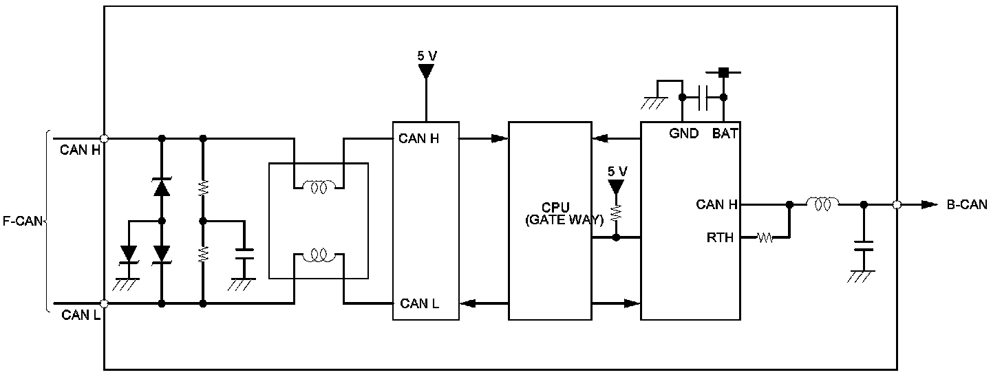 The body controller area network (B-CAN) and the fast controller area network (F-CAN) share information between multiple electronic control units (ECUs). B-CAN communication moves at a slower speed (33.33 kbps) for convenience related items and for other functions. F-CAN information moves at a faster speed (500 kbps) for "real time" functions such as fuel and emissions data. To allow both systems to share information, the gauge control module translates and relays the information from B-CAN to F-CAN and from F-CAN to B-CAN. This is called the Gateway Function.