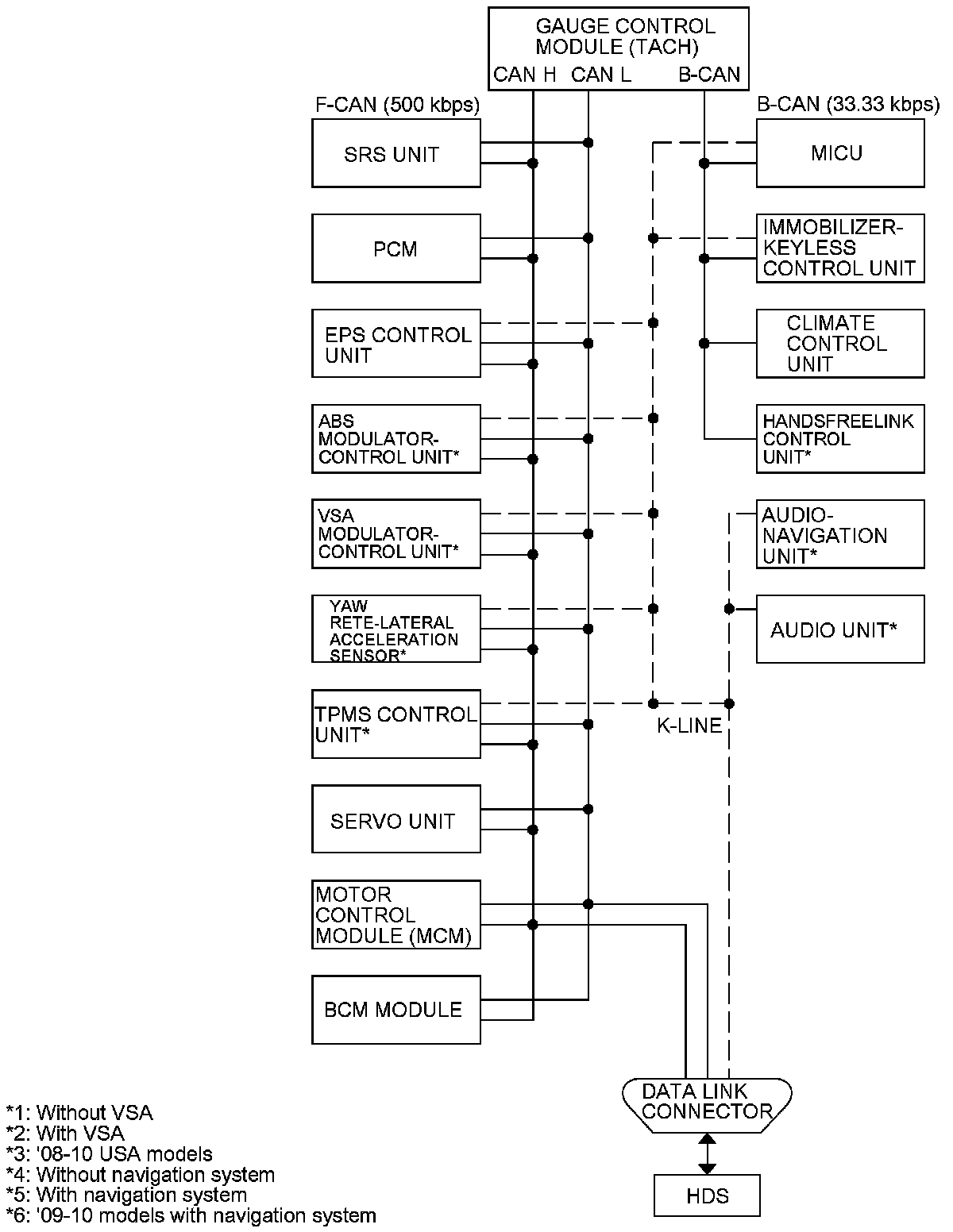 By connecting the HDS to the data link connector (DLC), the HDS can retrieve and indicate the diagnostic results from the MICU via a diagnostic line called the K-LINE. The K-LINE is a separate communication lines from the CAN line, but it is connected to most of the CAN related ECUs. The MICU is a gateway between the HDS and B-CAN related ECUs, and sends B-CAN diagnostic information to the HDS.