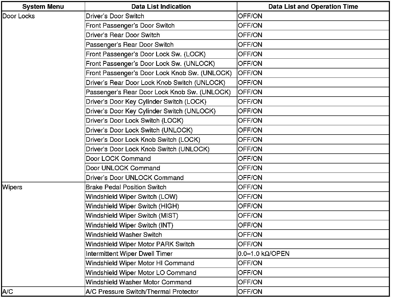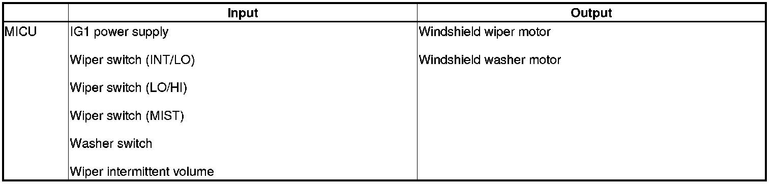 The MICU control of the windshield wiper motor and the windshield washer motor is based on inputs from each switch and B-CAN data.