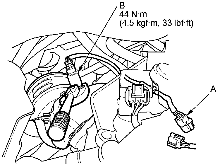 2. Disconnect the A/F sensor 4P connector (A), then remove the A/F sensor (B).