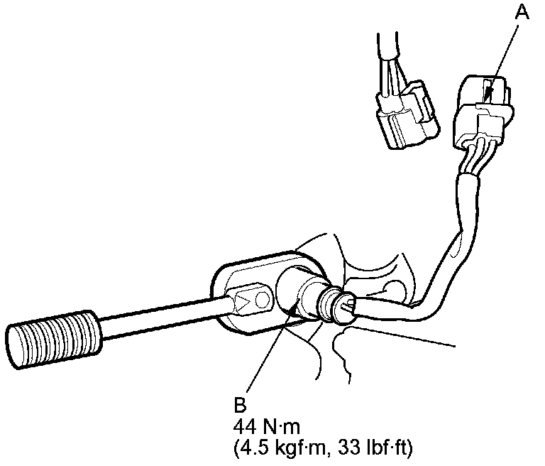 1. Disconnect the secondary HO2S 4P connector (A), then remove the secondary HO2S (B).