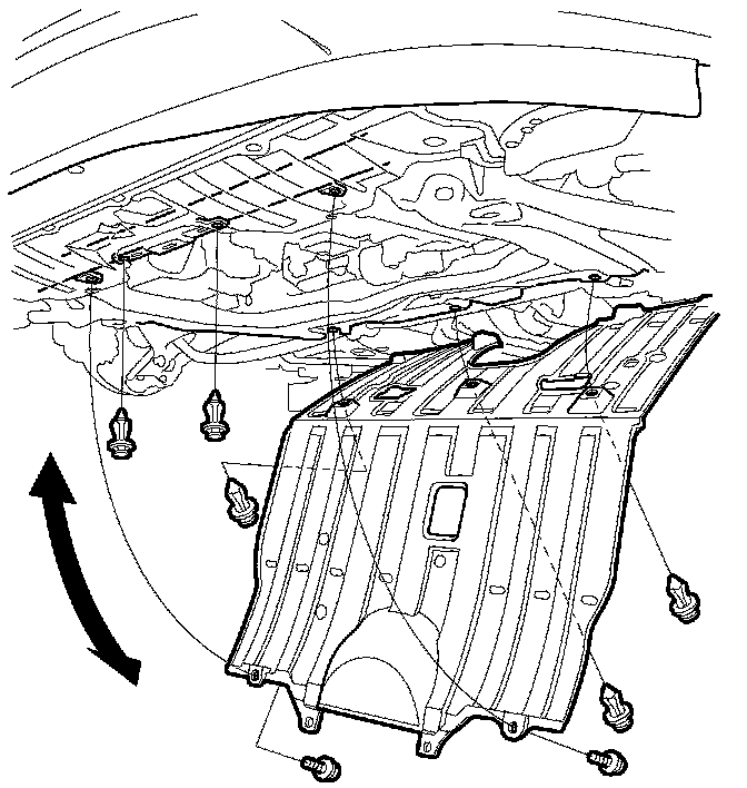 6. Remove the two bolts and five clips securing the front undercover, then lower the front undercover (from underneath the vehicle).