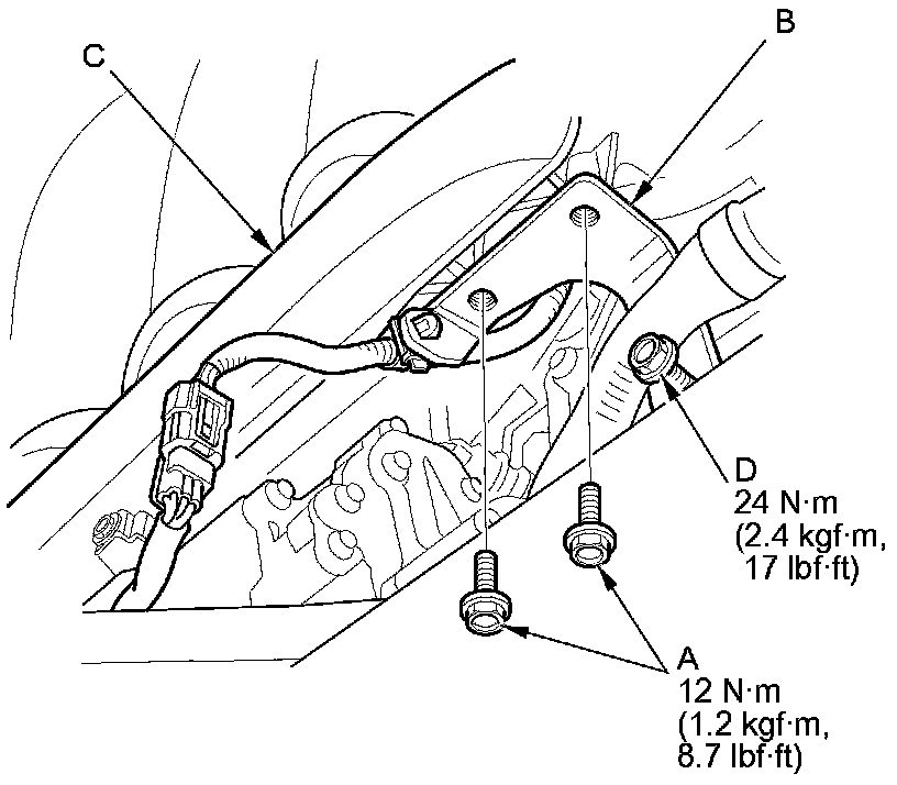 7. Remove the two bolts (A) connecting the intake manifold bracket (B) to the intake manifold chamber (C), and loosen the third bolt (D).