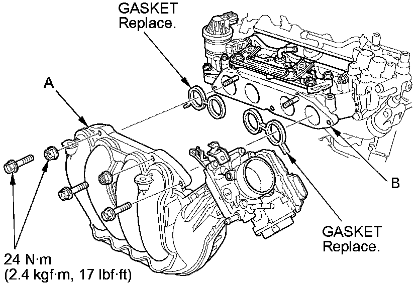14. Install the parts removed in reverse order of removal with new intake port gaskets, then do this: