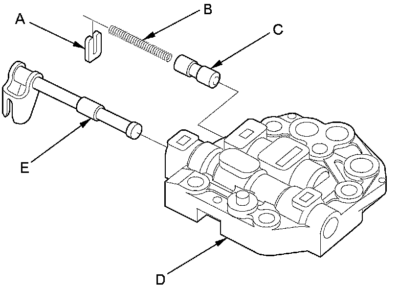1. Remove the spring seat (A), the valve spring (B), and the reverse inhibitor valve (C) from the manual valve body (D).