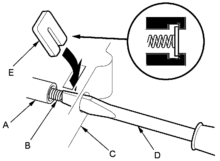 6. Install the reverse inhibitor valve (A) and the valve spring (B) in the manual valve body (C). Push the valve spring in using a screwdriver (D), then install the spring seat (E).