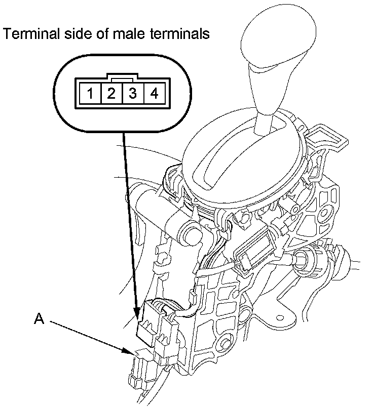 2. Disconnect the A/T gear position indicator panel light/park pin switch connector (A).