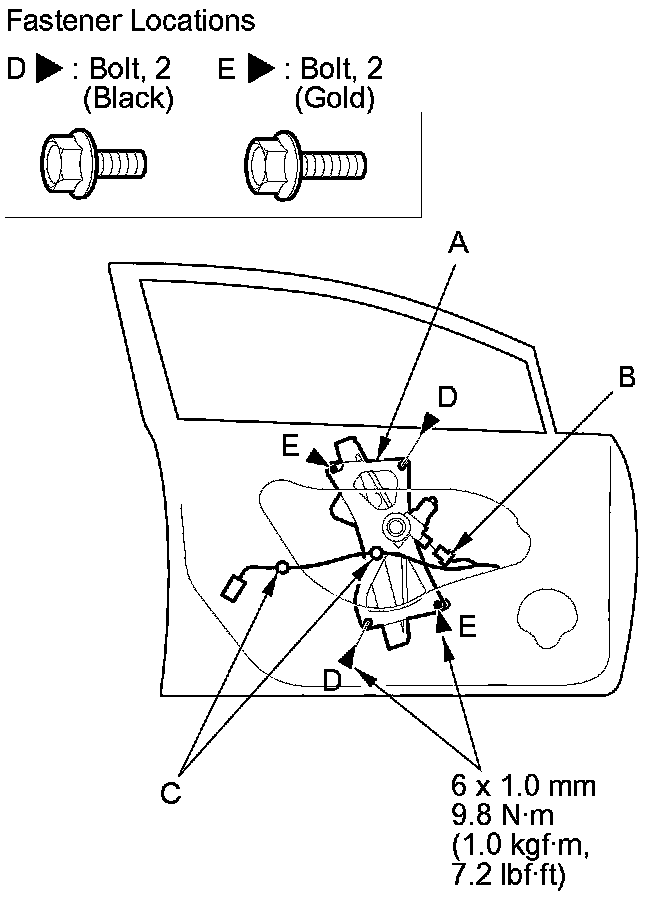 2. Remove the bolts (D), and loosen the bolts (E).