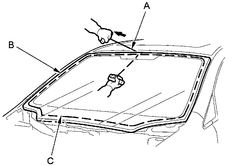 6. With a helper on the outside, pull the piano wire (A) back and forth in a sawing motion. Hold the piano wire as close to the windshield (B) as possible to prevent damage to the body and the dashboard. Carefully cut through the rubber dam and the adhesive (C) around the entire windshield.