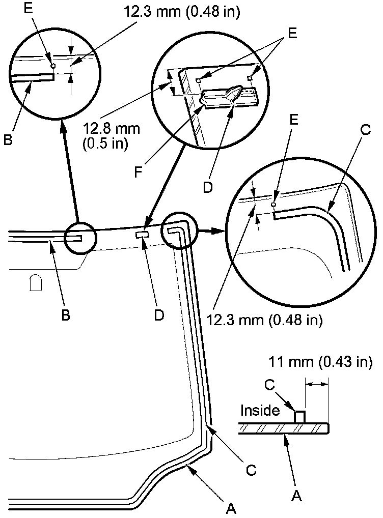 11. Apply glass primer to the upper clips mounting areas on the windshield (A), and let it dry. Remove the adhesive backing and attach the upper rubber dams (B), the side rubber dam (C), and the upper clips (D) with adhesive tape to the inside face of the windshield as shown:
