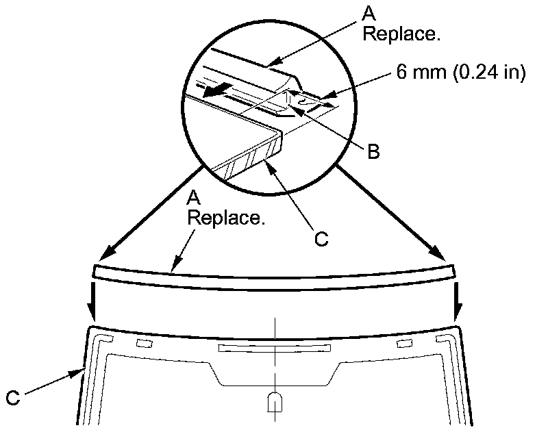 12. Attach the windshield molding (A) with adhesive tape (B) to the upper edge of the windshield (C). Be careful not to touch the windshield where the adhesive will be applied.