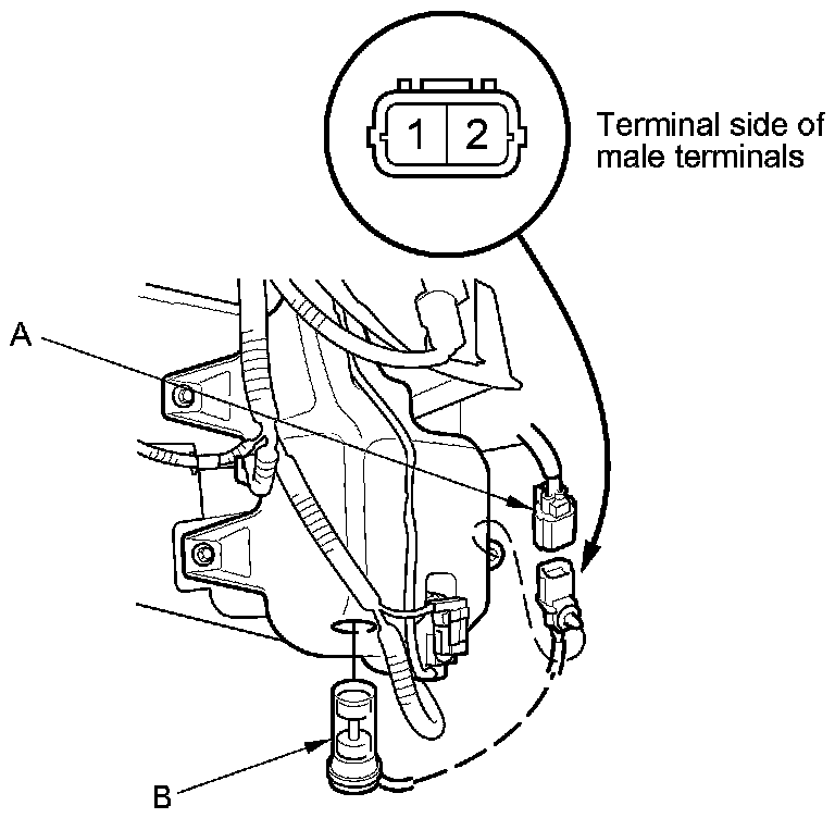 2. Disconnect the 2P connector (A) from the washer fluid level switch (B).