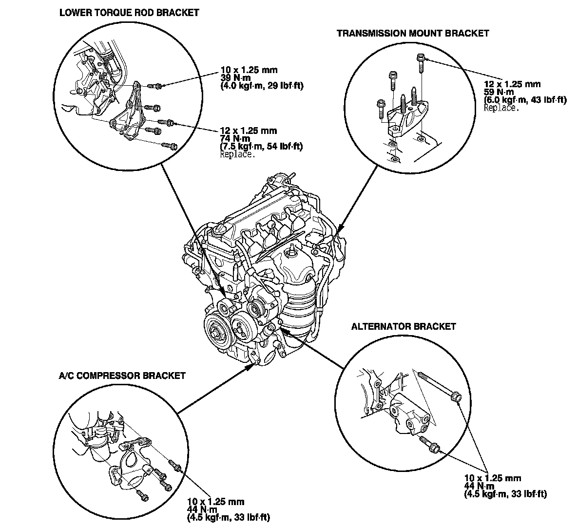 1. Install the engine mount brackets and the accessory brackets, then tighten their bolts to the specified torque.