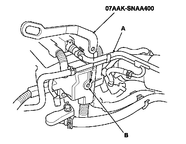 3. Install the 1.8 support eyelet (07AAK-SNAA400) behind the breather pipe (A) and down to the thread hole (B) on the cylinder head.