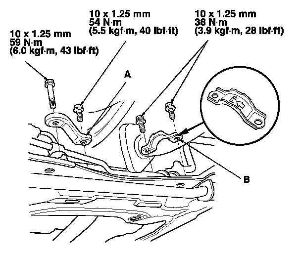 24. Install the power steering (P/S) line on the clamp (A), then install the P/S line brackets (B) on the front subframe.