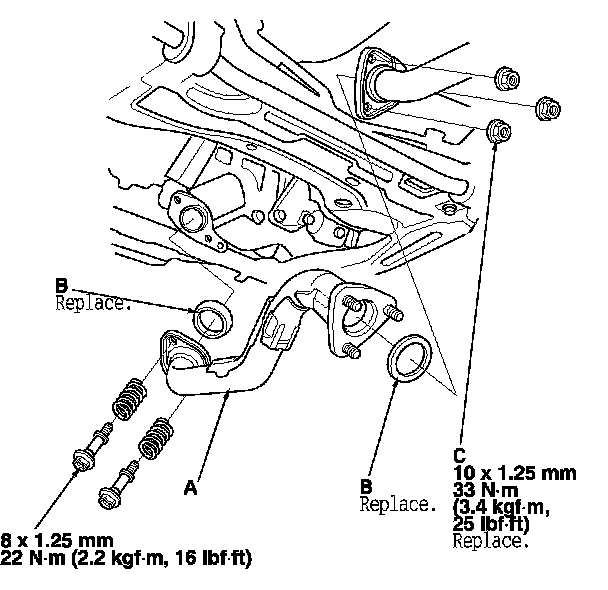 13. Align all reference marks (A) on the front subframe (B) with the edge of the body (C), then tighten the bolts on the front subframe to the specified torque.