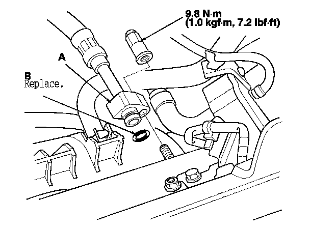 45. Connect the fuel feed hose (A). Use new O-ring (B).