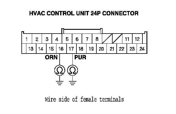 8. Check for continuity between body ground and HVAC control unit 24P connector terminals No. 16 and No. 17 individually.