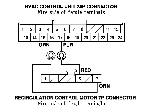 11. Check for continuity between following terminals of the HVAC control unit 24P connector and the recirculation control motor 7P connector.